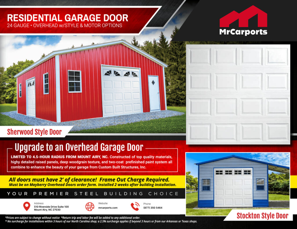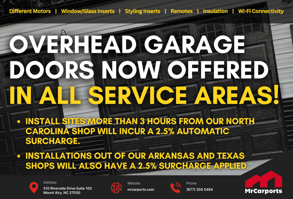 At Mr Carports, we provide Overhead Garage Doors across all our service areas! From functionality to style, we have the right options to upgrade your structure and make it more versatile.