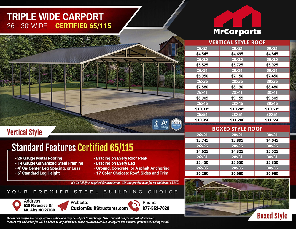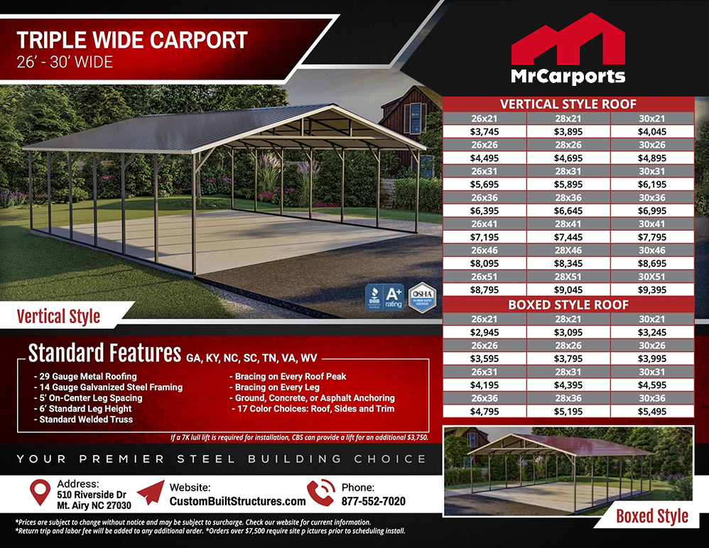 Whether you’re safeguarding multiple vehicles, setting up a workshop, storing equipment, or creating a covered area for gatherings, a Triple Wide Structure offers unmatched durability and customization. Built with high-quality galvanized steel and weather-resistant roofing, these structures deliver long-lasting protection and peace of mind in any season.
